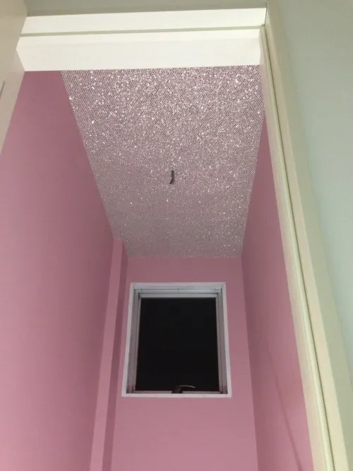 トイレの壁をピンクに、天井にラメをちりばめました。こだわりポイントです!